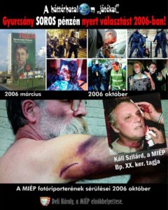 A Soros által létrehozott Open Society Foundations (Nyílt Társadalomért Alapítvány) a nemzetközi DEMOS Alapítvány nevű agytrösztnek utalt át tetemes összeget, (129 ezer dollárt,) melynek magyarországi kirendeltsége főszerepet játszott Gyurcsány Ferenc újraválasztásának kampányában! Miután Gyurcsány beismerte, hogy “hazugságokkal” nyerték meg a választást, a lemondását teljes joggal követelő tüntetőket véres rendőrterrorral verette szét! Szemkilövetések, lőtt sebek, véresre verések százszámra, törvénytelen viperahasználat, vízágyú, az azonosító nélküli,- a magyart törve beszélő, rendőrruhába öltöztetett,- feltételezetten izraeli kommandósokkal! Az Európai Unió egyetlen komoly kifogást sem emelt Gyurcsányék brutális tettei ellen! Nyugatról SENKI NEM KIÁLTOTT “DIKTATÚRÁT”(!), senki nem szólított fel a kormány lemondására, nem érkeztek ezrek ingyen repülőjeggyel tüntetni a “szabadságért és demokráciáért”!!!… Természetesen, a “nagy humanista” Soros sem mozdult!… Ma azonban változatlanul nagy pénzekkel támogatja az egyébként is milliárdos Gyurcsányt, a cégeinek ad megbízásokat… Ennyit a Soros-körök” hálózati hatalmáról és az épülő “LIBERÁLIS” VILÁGDIKTATÚRÁJUK kettős mércéjéről… Ezt a globális-kifosztó „VERSENYTÁRSADALMAT” a FIDESZ is kiszolgálja, csak egészen más technikával!…
